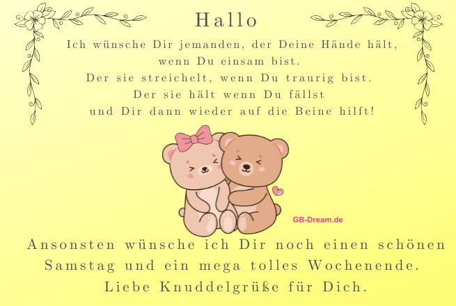 Entdecke die besten Samstagsgrüße und Bilder für WhatsApp auf whatsappbilder-kostenlos.de! Diese Plattform bietet eine Vielzahl von kostenlosen Bildern, die perfekt sind, um deinen Freunden und deiner Familie ein Lächeln ins Gesicht zu zaubern. Egal, ob du etwas Lustiges oder Inspirierendes suchst, hier findest du die passenden Bilder für jede Gelegenheit. Mit einer großen Auswahl an Jappy GB Bildern und Facebook-Bildern ist es einfach, deine Nachrichten aufzupeppen. Besuche uns jetzt und bringe frischen Wind in deine Chats! In der GB Kategorie Samstag GB Pics seht Ihr Bilder wie das Samstags Gruss Bild, Samstag Gästebuch Bilder, Samstag Grusskarten und Samstag für die Facebook Pinnwand, für verschiedene Gaestebücher, WhatsApp Bilder, Jappy, Foren und Communities.